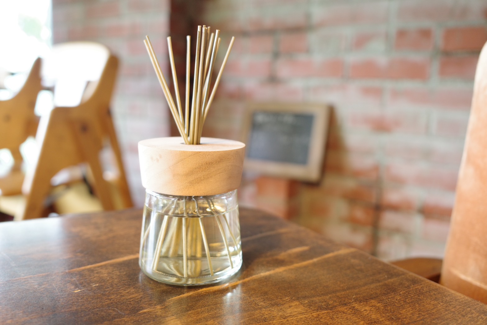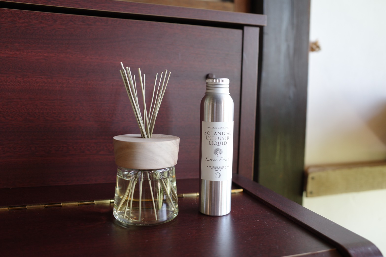 ボタニカルディフューザーリフィルの液を、こぼさないように注ぎます。「い草リード」を挿してください。すぐに香らせたい場合は、上下逆さまにすると香りが広がりやすくなります。